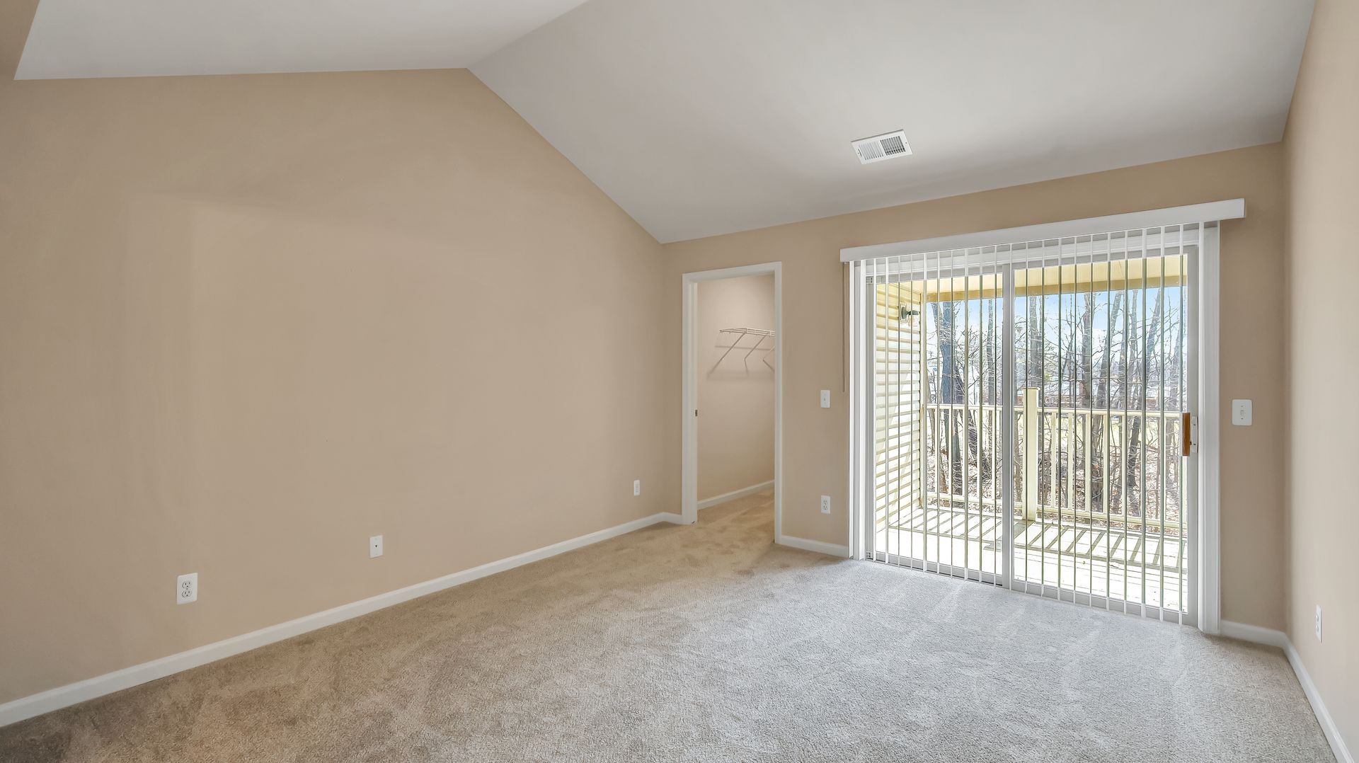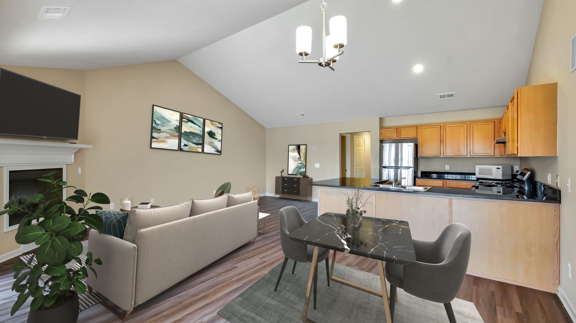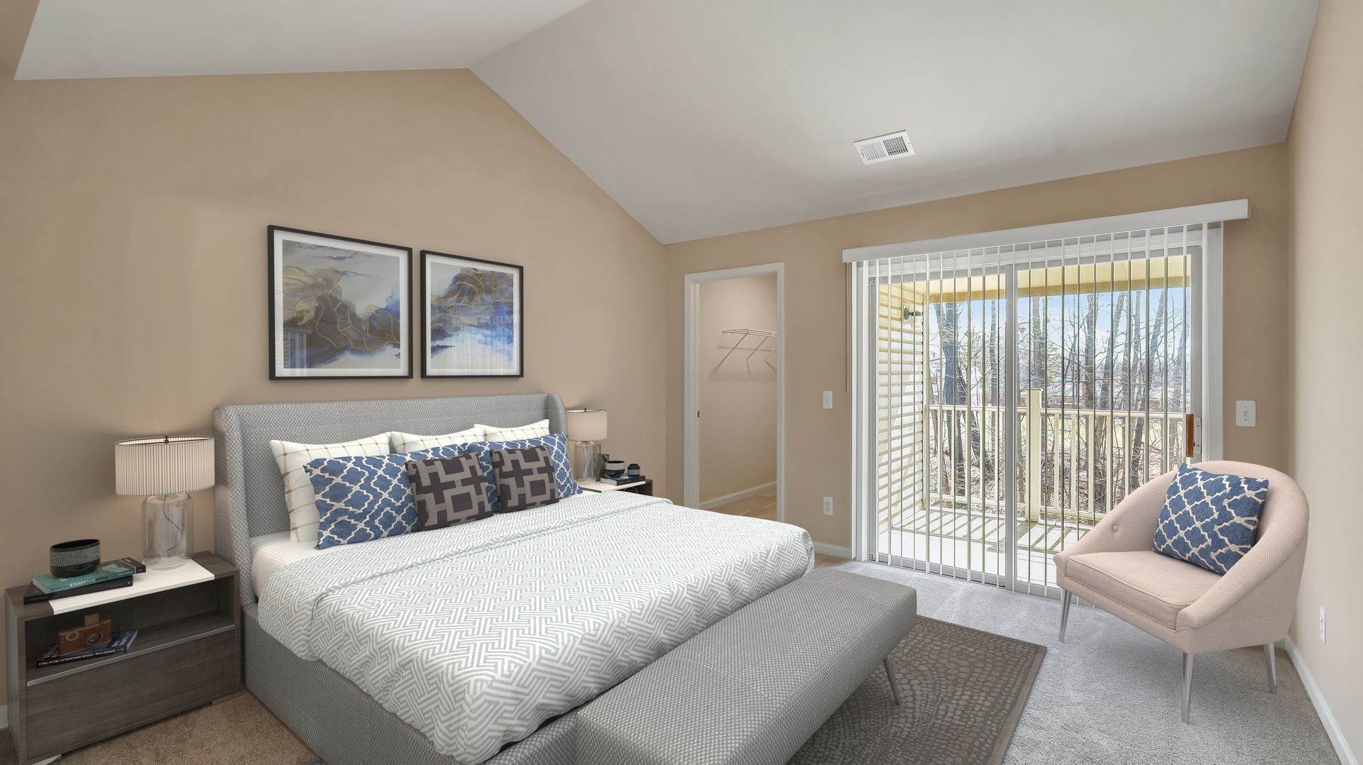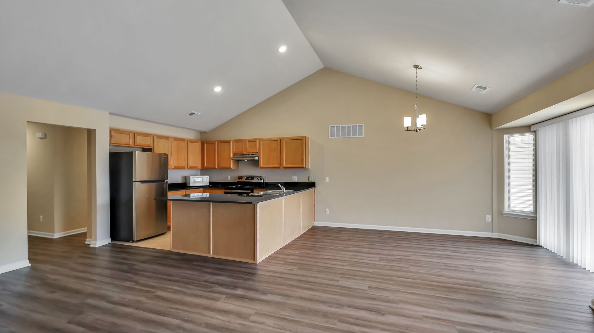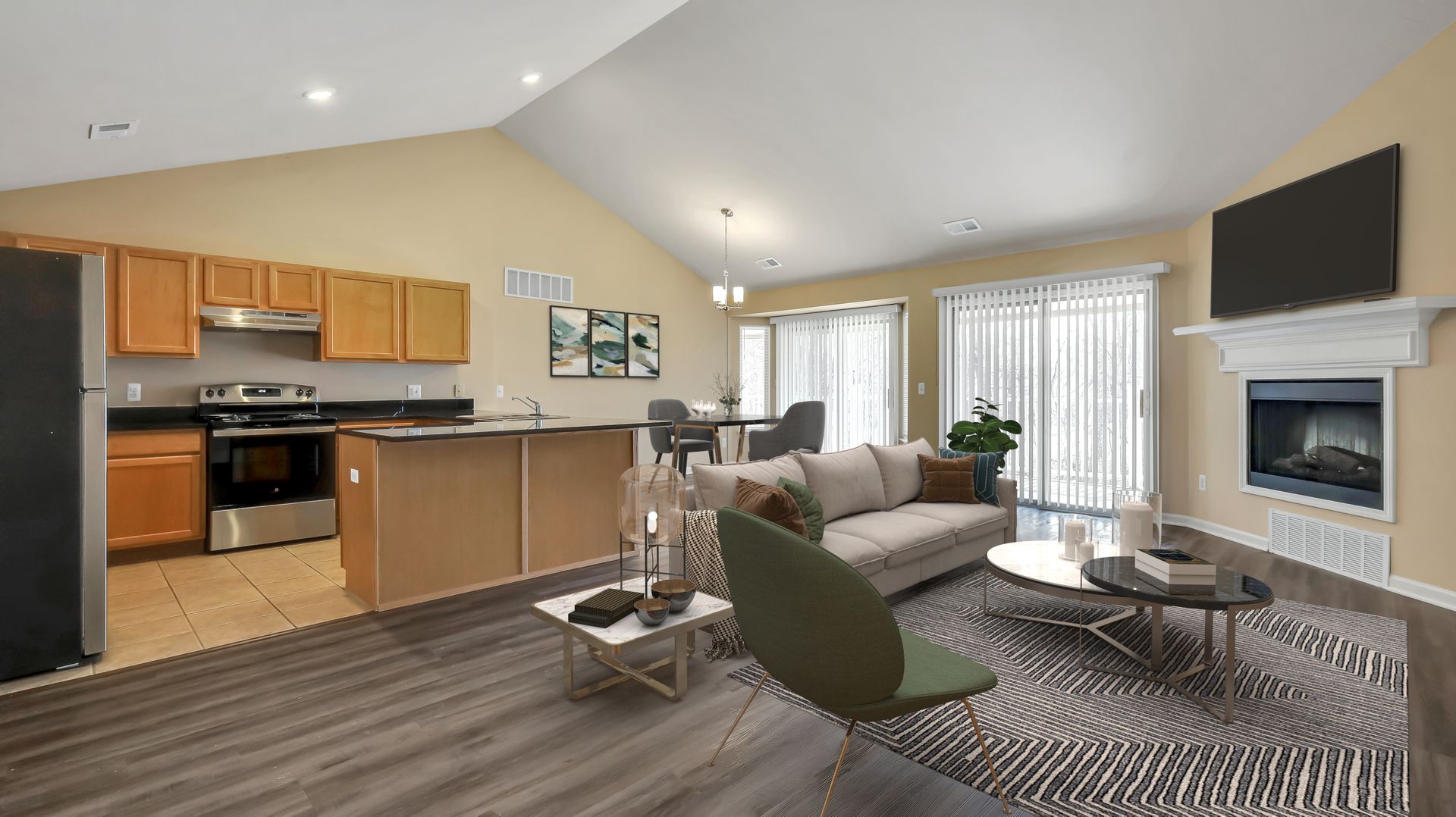 The Meadow is a very large two bedroom upper apartment. This apartment features a balcony that overlooks our beautiful landscaped grounds. The balcony is the width of the entire apartment with three full sized door walls to enter and exit from. This is our largest two bedroom apartment that has an open floor plan concept. This apartment also comes fully equipped with all the appliances, one car attached garage, personal private entrance, electric fireplace, two full size bathrooms, walk in closets, and vaulted ceilings!